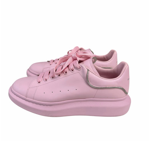 Shelving unit with various designer handbags and shoes against a patterned wall.