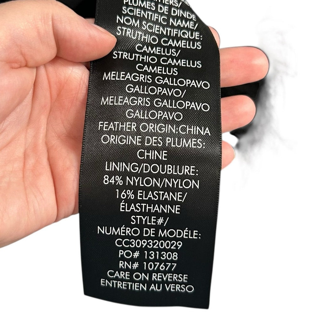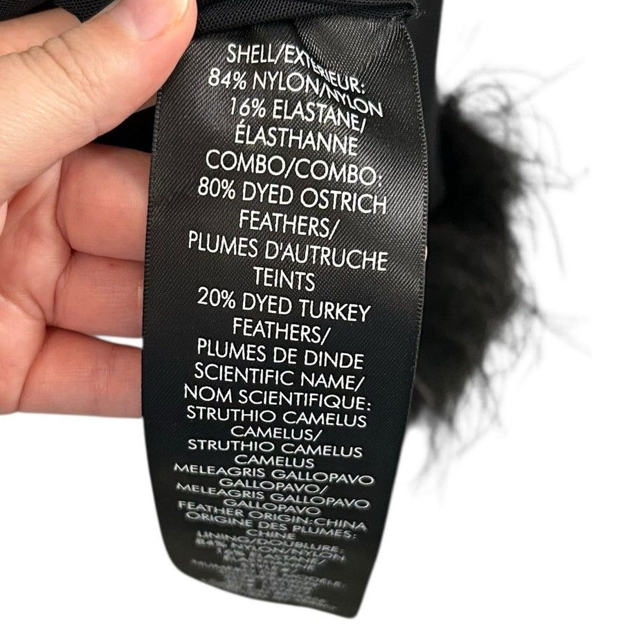 • Features: Nylon Blend, Black, Delaina Style, Feather Cuff, Long Mesh Sleeves. Dyed Ostrich Feathers/Dyed Turkey Feathers, Crew Neck, Back Zipper Closure