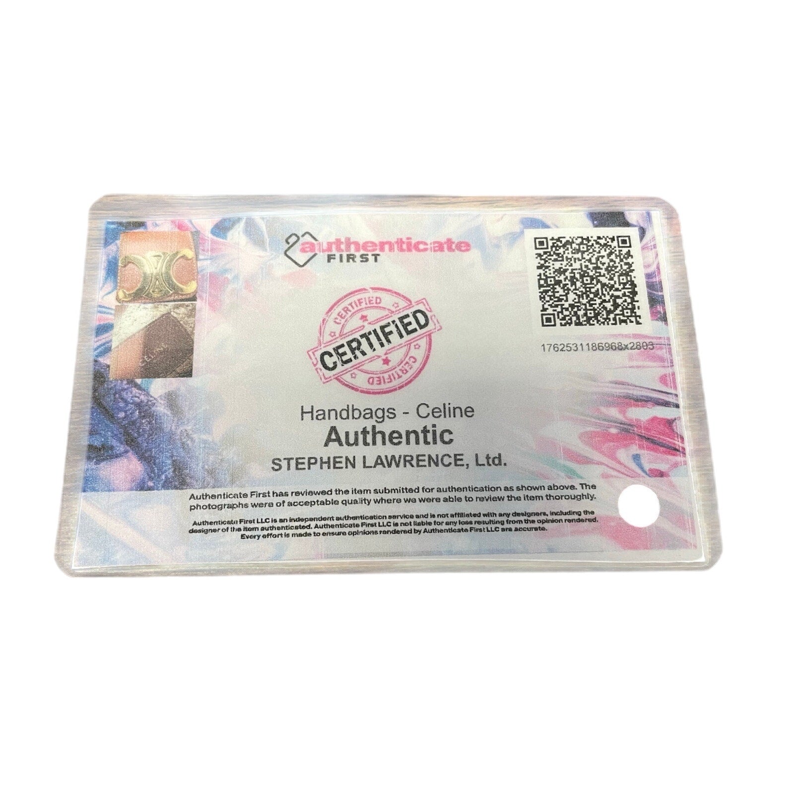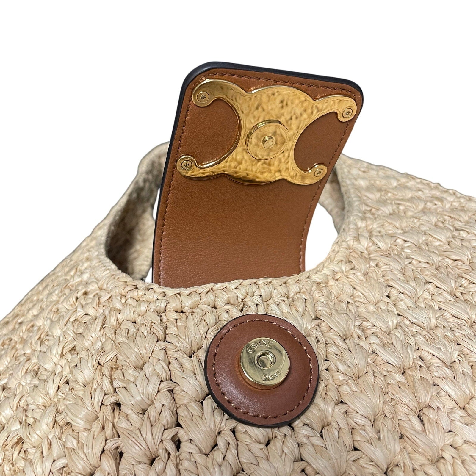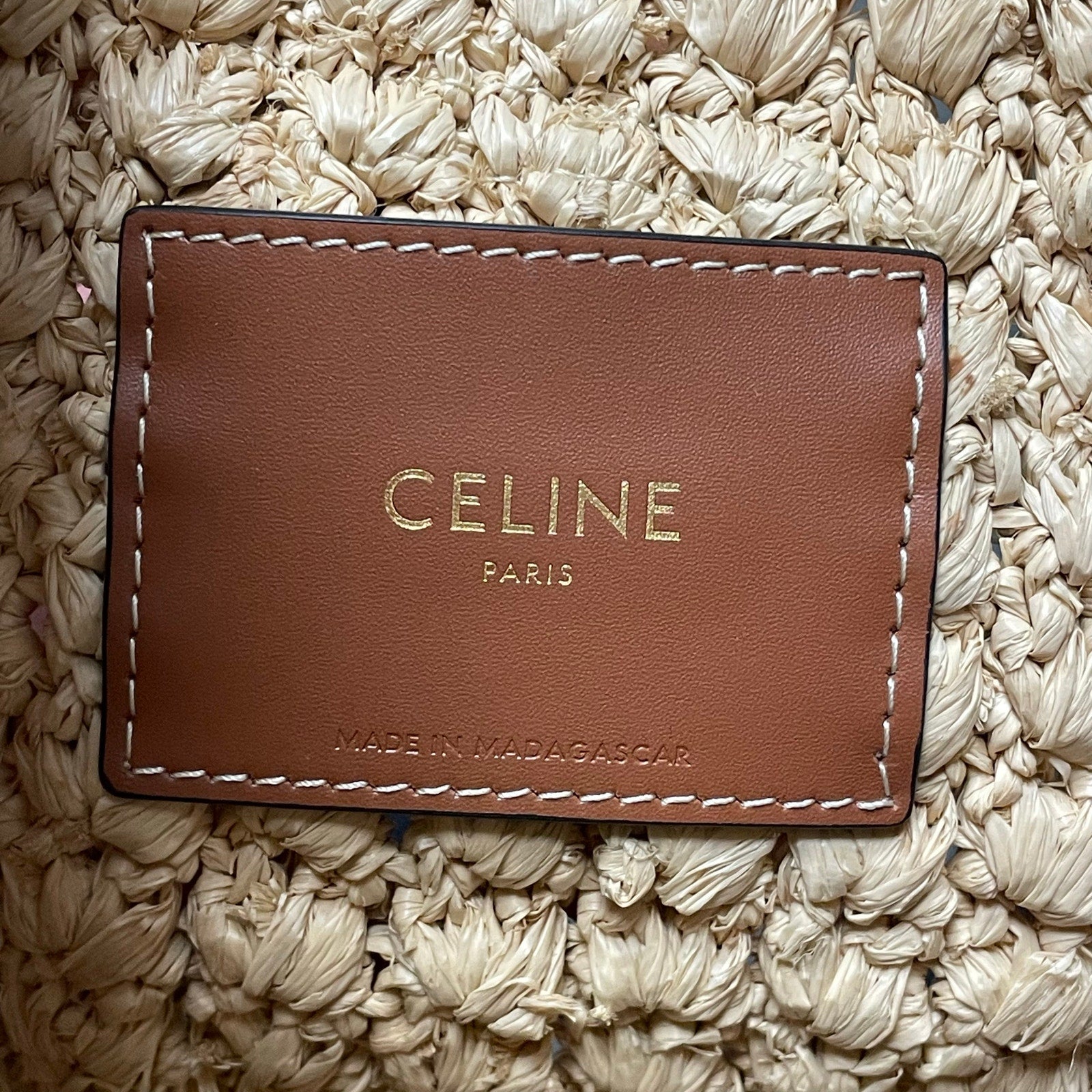 • Features: Celine Cabas Triangle Raffia & Calfskin Leather Tote Handbag in Natural / Tan, Raffia with tan calfskin leather trimming, Gold toned finishing and hardware, Leather flap with triomphe magnetic closure, One main compartment, Comes with card of authenticity