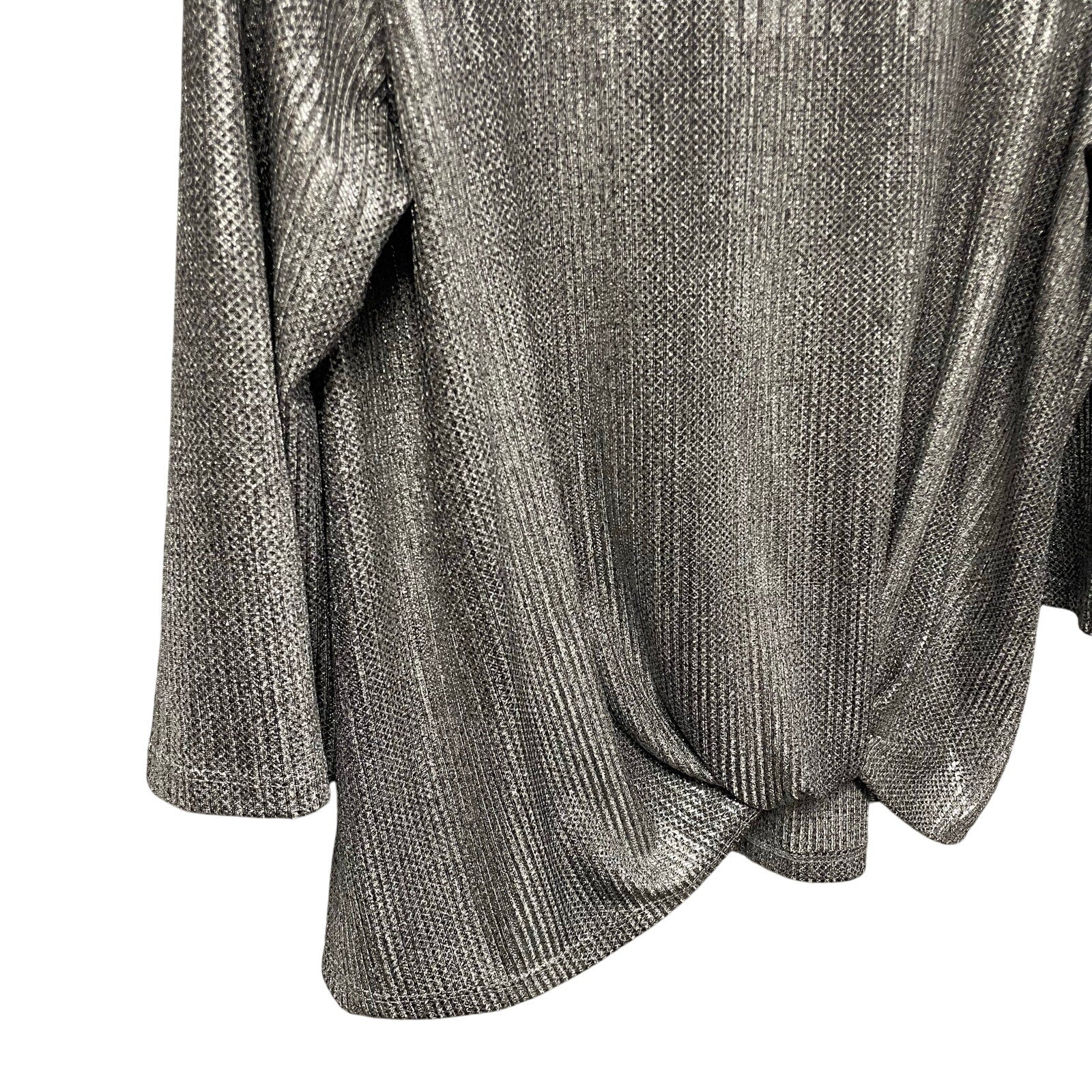 • Features: Pullover styling, 3/4 length sleeves, Silver metallic knit, Gathered / knotted detail off center at bottom hemline