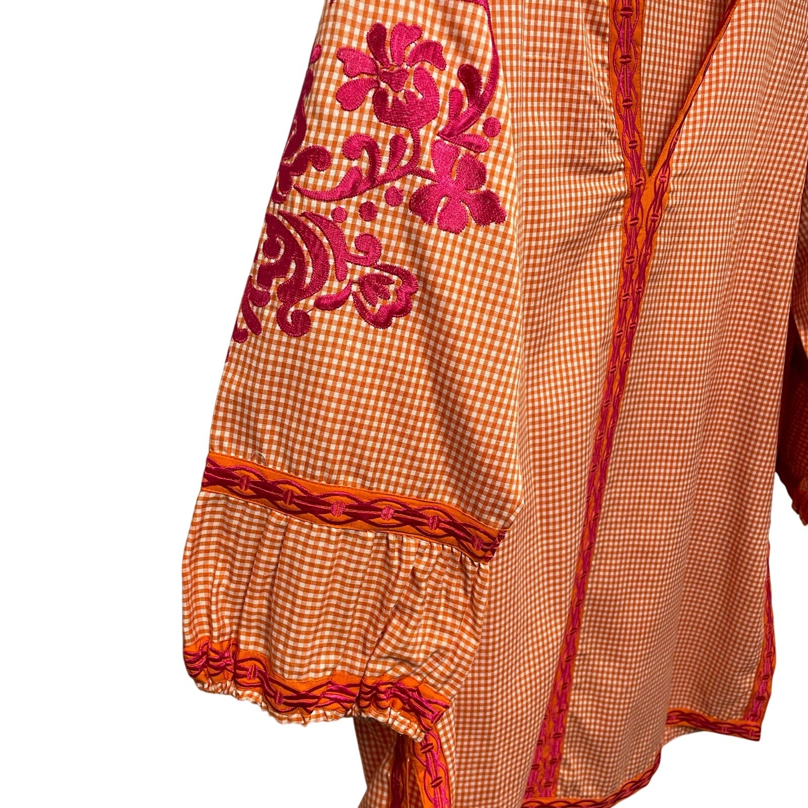 • Features: Pullover styling, Cotton blend, Side slits, 3/4 length sleeves with elastic at cuffs, Split neckline, Orange and white gingham print, Orange pink embroidered trim, Pink floral embroidery on sleeves, Tunic top