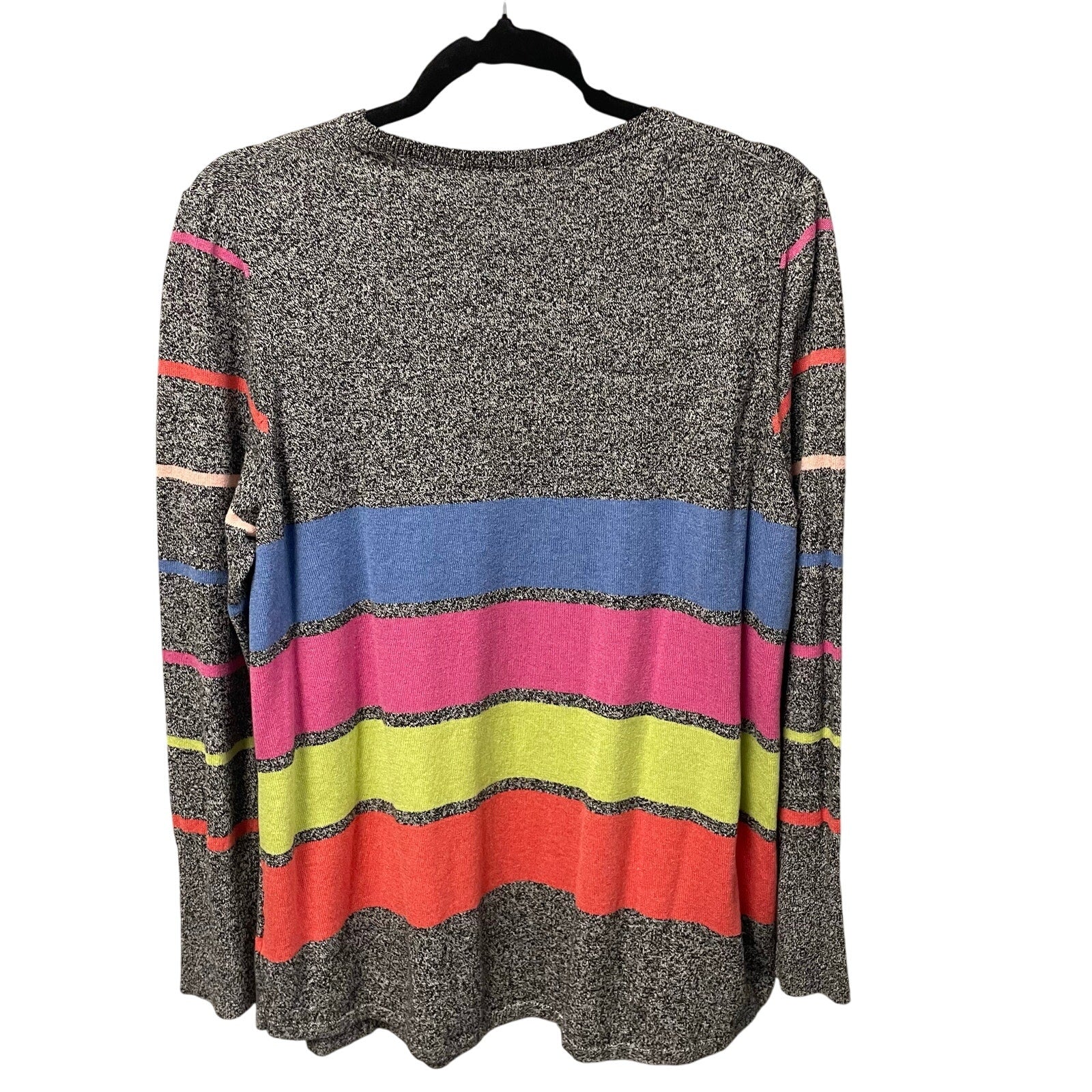 • Features: Pullover styling, Black and white heathered knit with multicolor striped pattern on front back and sleeves, Crewneck, Cotton blend