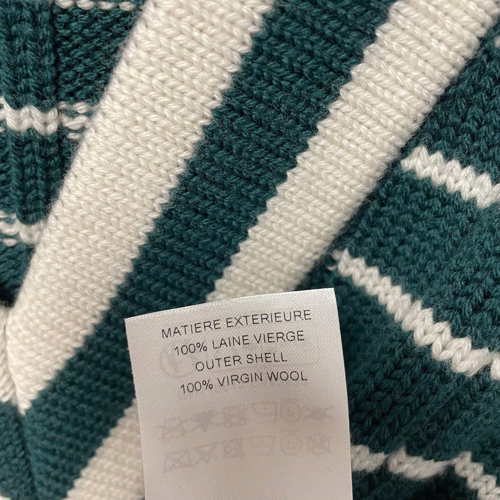 • Features: Pullover styling, Long sleeve, V Neck, Ribbed knit, 100% Virgin Wool, Forest green and white striped