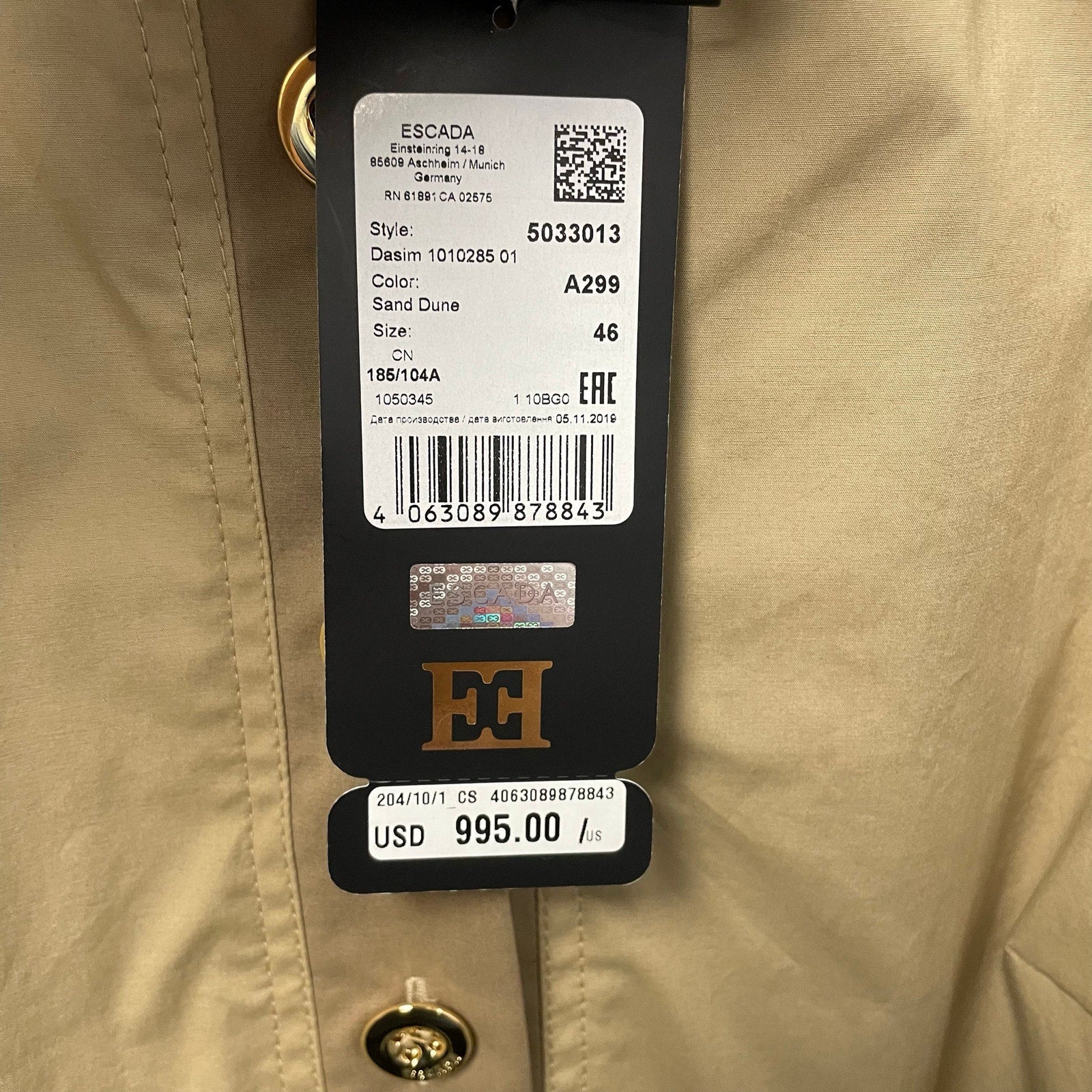 • Features: Partial button up front, Cuffed sleeves with button closure, Collared, Gold toned Escada engraved hardware buttons, Sand Dune / light tan color with light brown accent sections, Midi length, 95% Cotton, Shirt dress