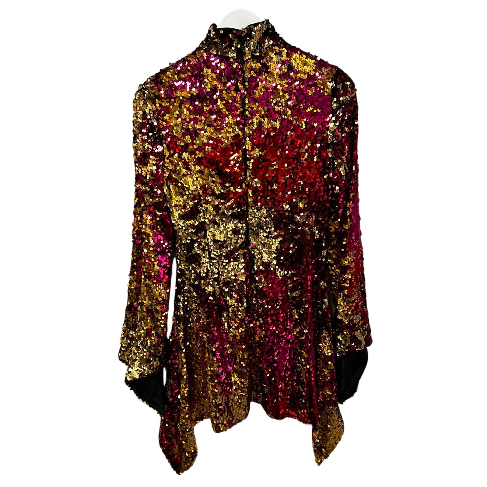 • Features: 100% Polyester, Multicolor, Bell Sleeves, Sequin Embellished Tulle, Mini Length, Handkerchief Hem, Concealed Hook and Zip Fastening