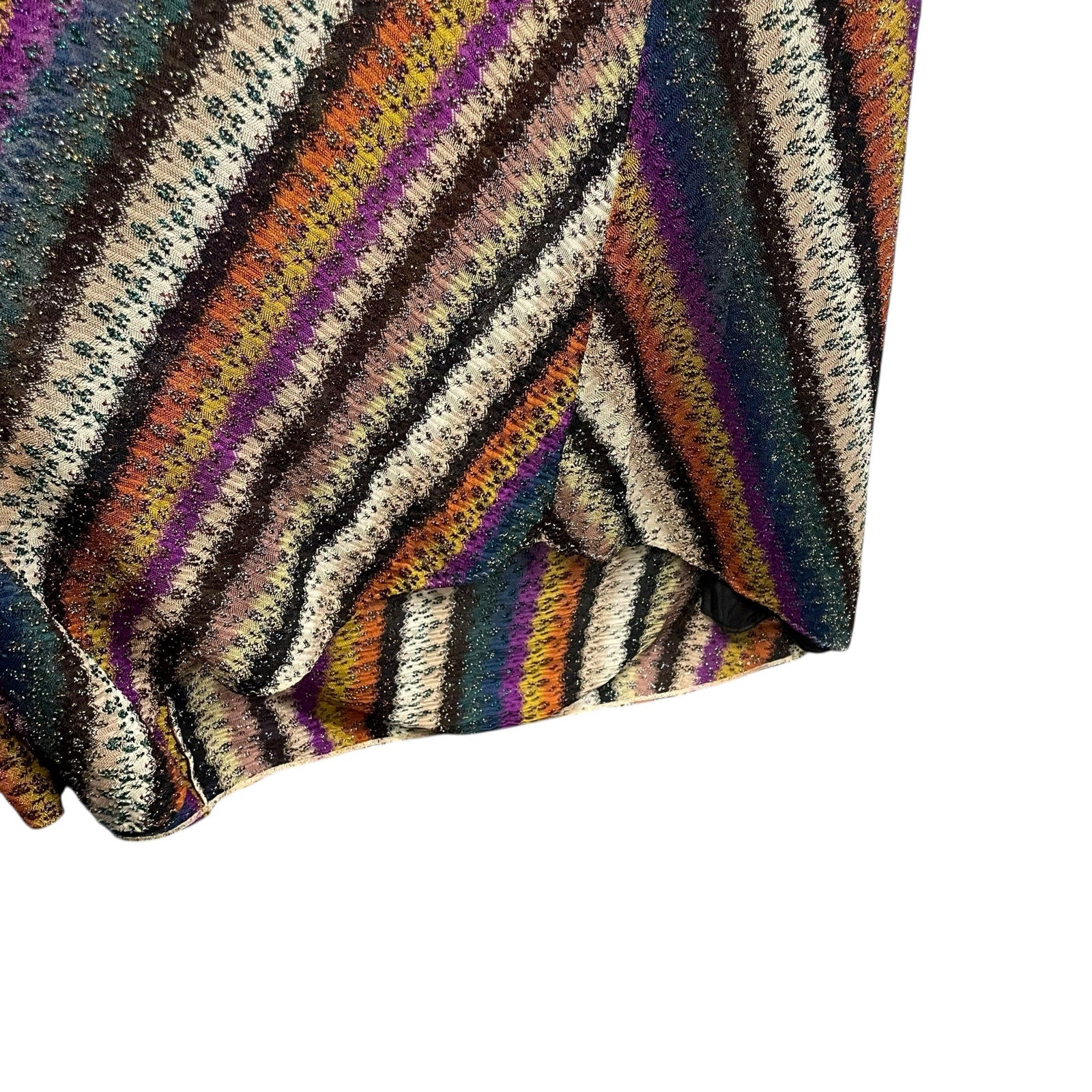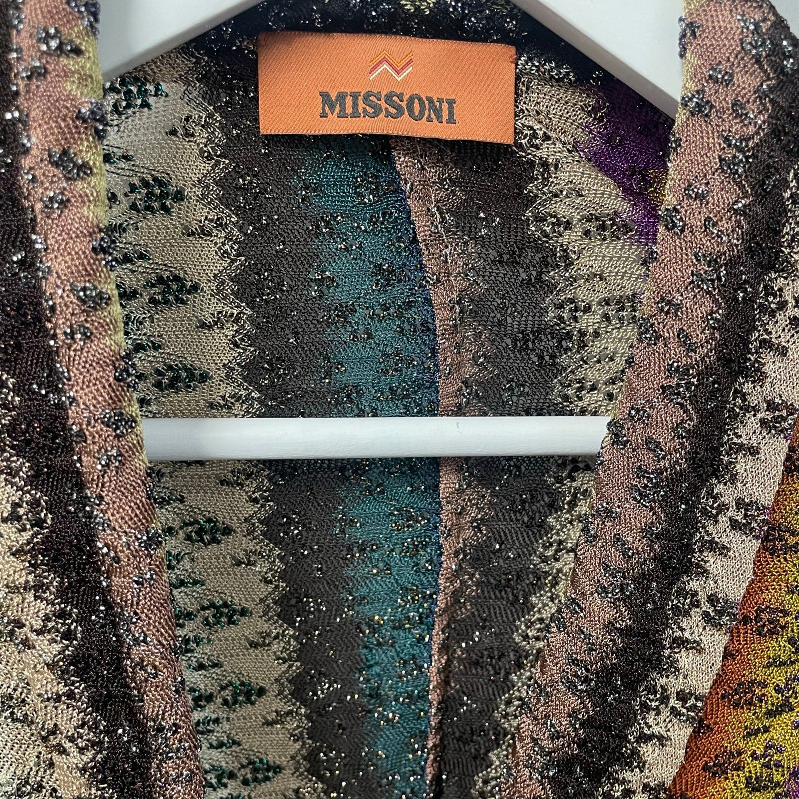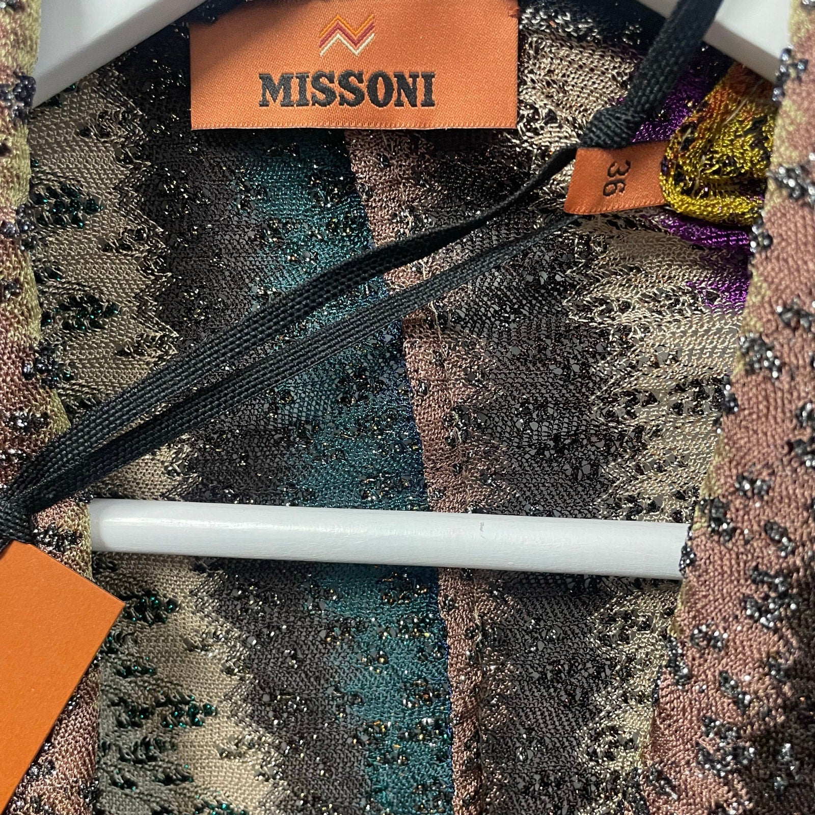 • Features: Long / Maxi length, Short cap style sleeves, Deep neckline with knot detail, Raschel lace tulle knit in multicolor, Viscose blend with signature Missoni lamé threads, Hidden side zip closure, Slip lining in black, Vibrant colorful striped pattern with metallic detailing throughout, Slight high low hemline, Original tags still attached