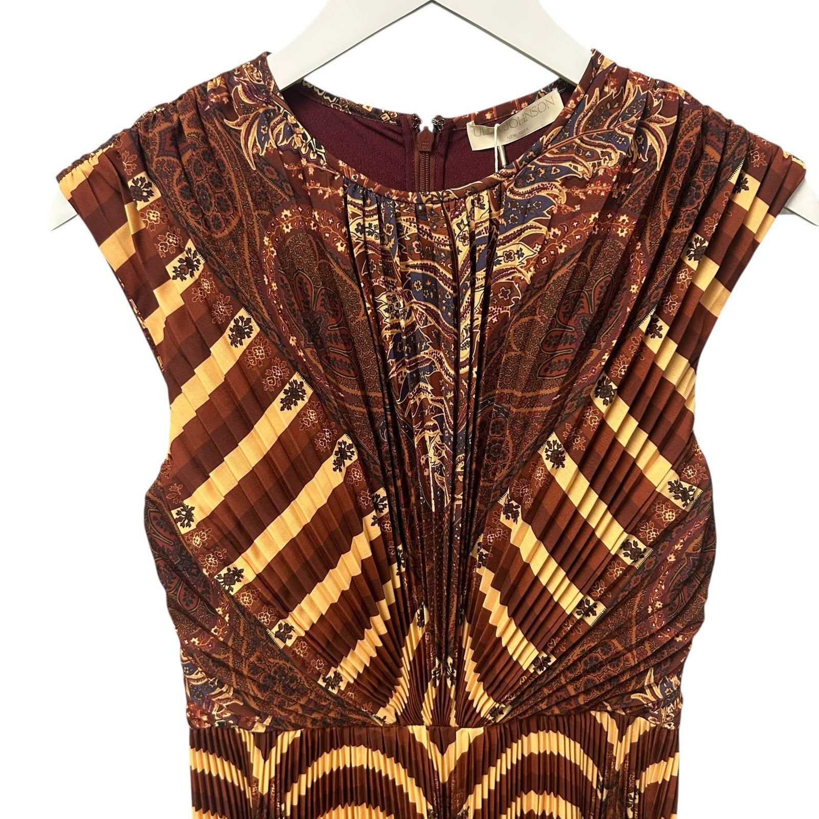 • Features: 100% Polyester, Pleated, Sleeveless, Midi Length, Stripe/Paisley Print, New with Tags, Concealed back zip closure