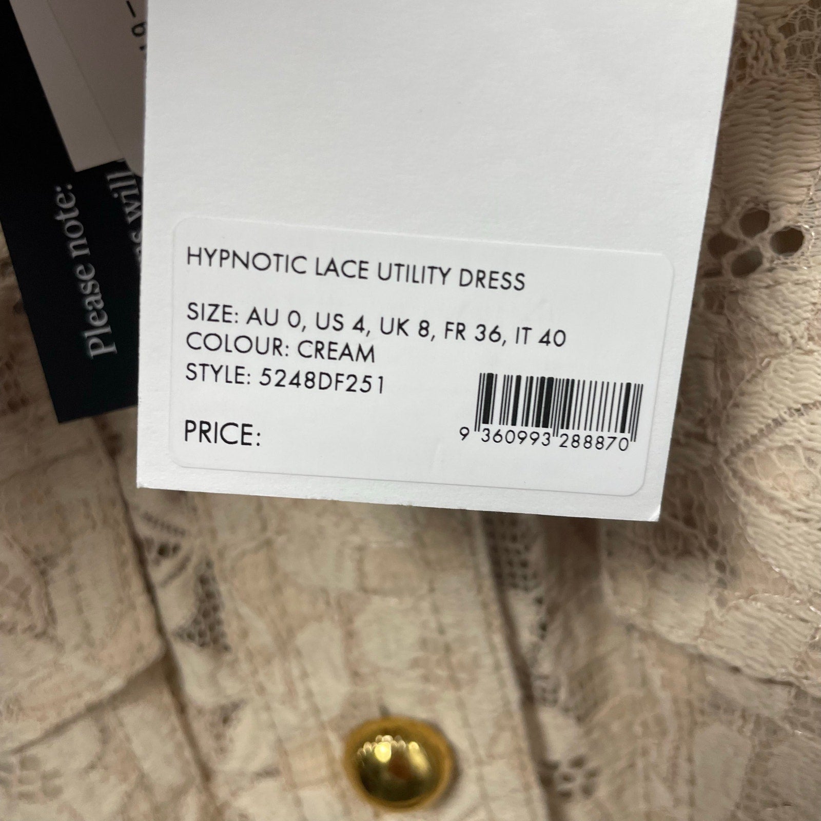 • Features: Mini length, Belted waist, Utility / shirt dress, Cream lace exterior, Partially lined, Gold toned hardware buttons up front, on flap pockets, and at cuffs, Long sleeve, Collared, Zimmermann Hypnotic Lace Utility Dress