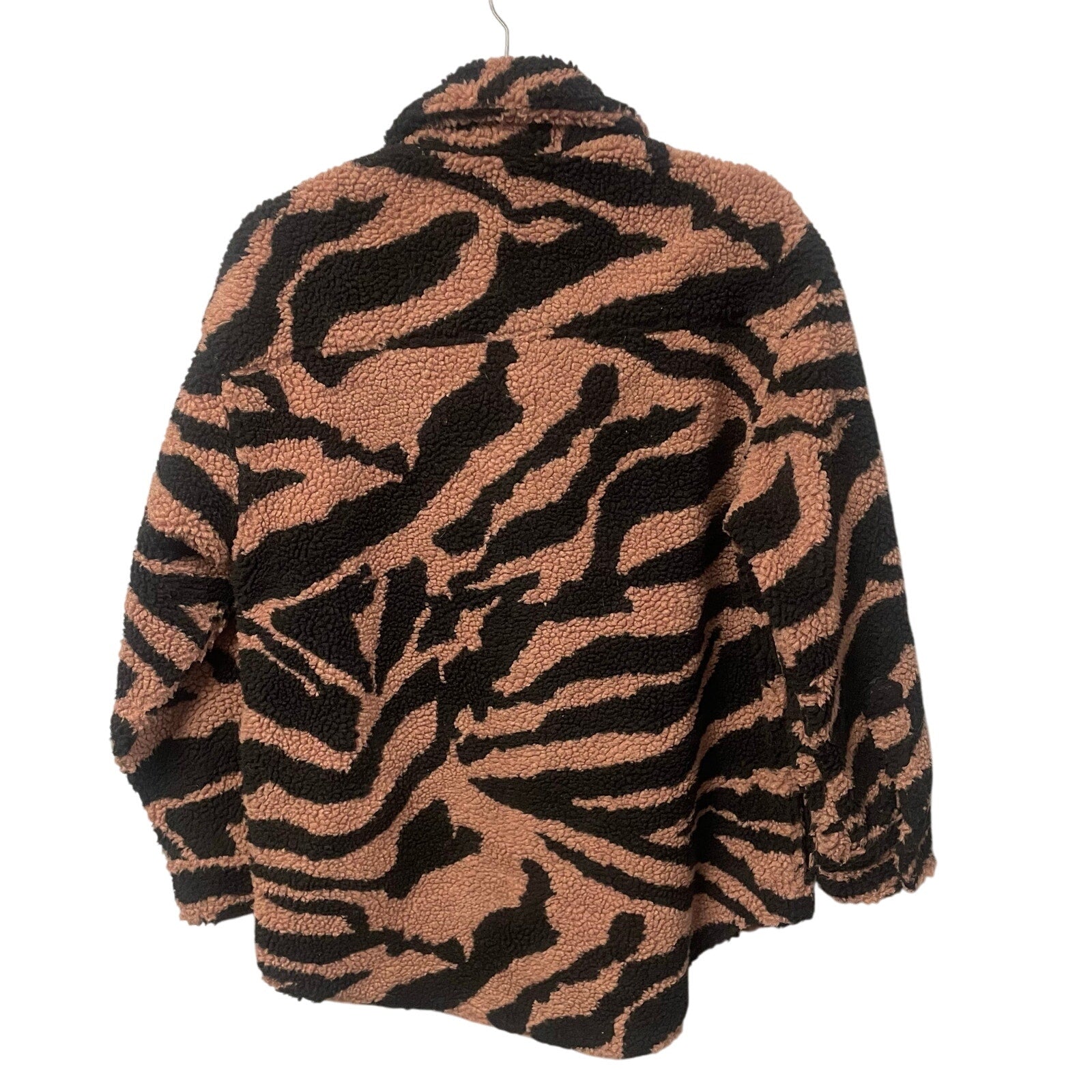 • Features: Snap button up front closure, Snap buttons at cuffs, Front patch pocket, Side pockets, Faux shearling outer, "Clay" and black zebra striped print