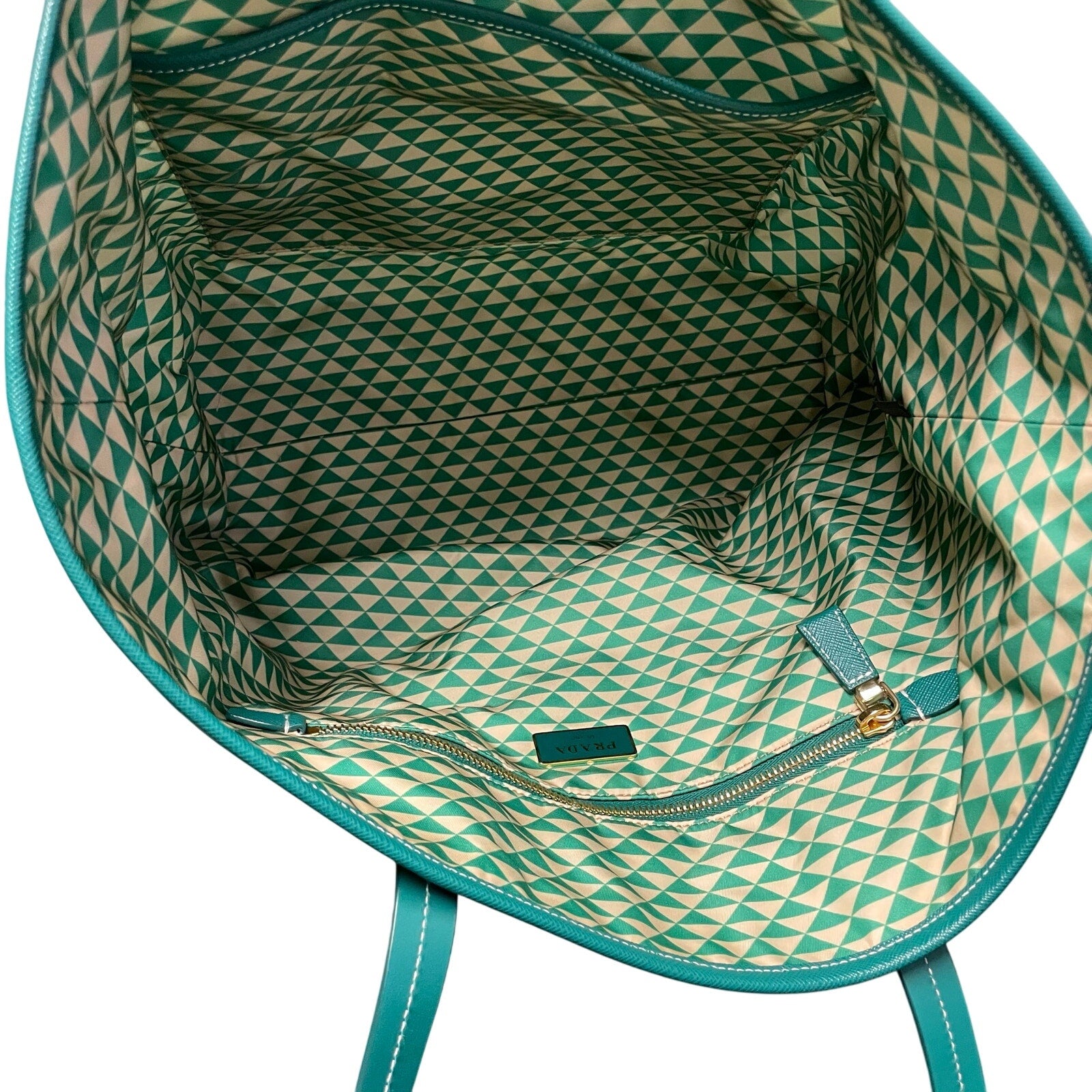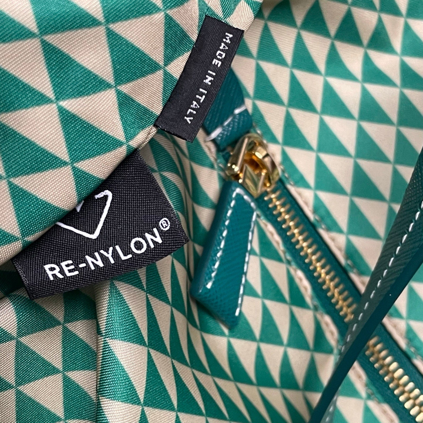 • Features: Re-nylon exterior with leather trim and leather handles, Open top with interior side zip closure compartment and slip pockets, Off white and green geometric triangle pattern with Prada hardware logo plate in green and gold on front upper, Prada Tessuto Triangulum Nylon Tote Bag, Comes with original care card/packet and a card of authenticity