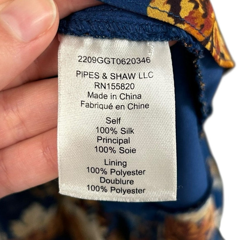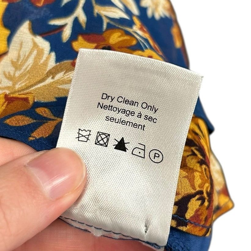 • Features: 100% Silk, Hedera Style, Orange, Blue, Floral Print, Mini Length, Long Sleeve, Ruched, Puff Sleeves
